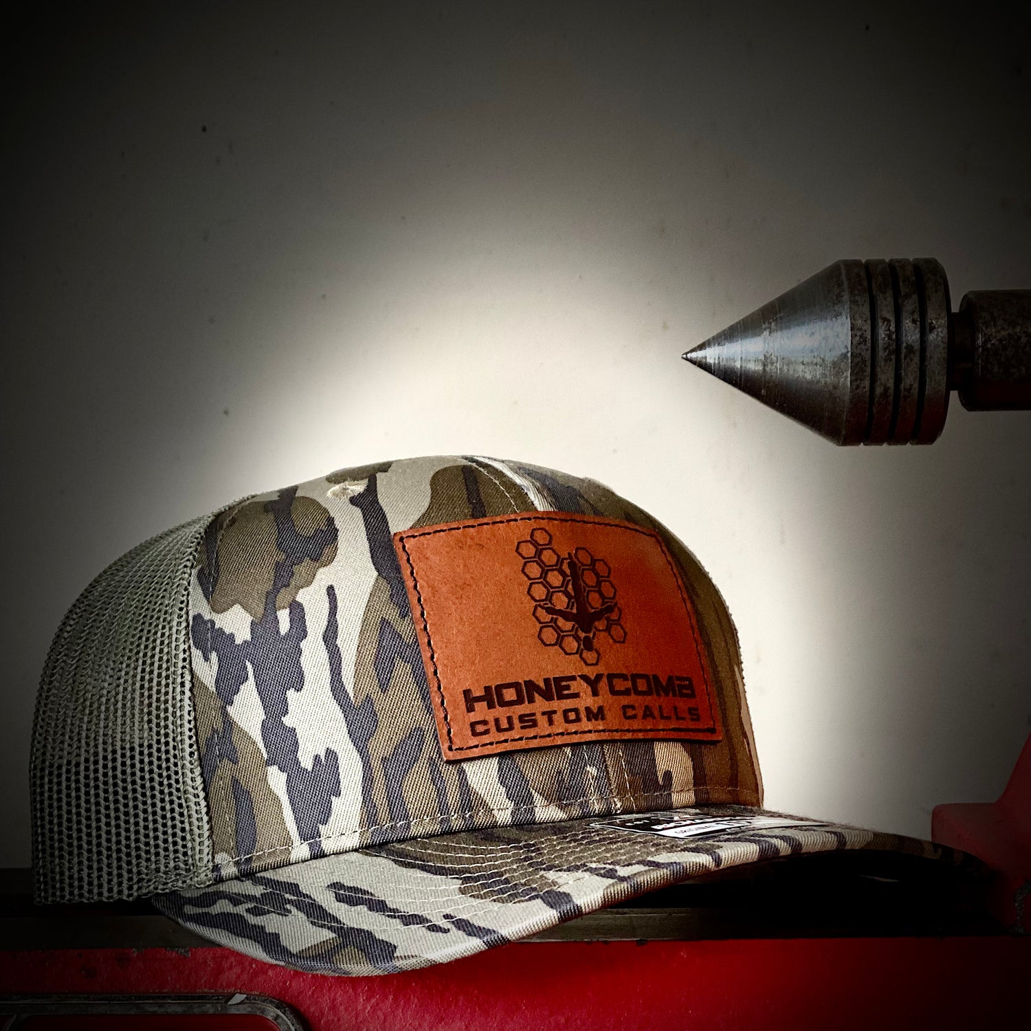 Bottomland/ Loden Richardson trucker snapback with 100% real leather patch.